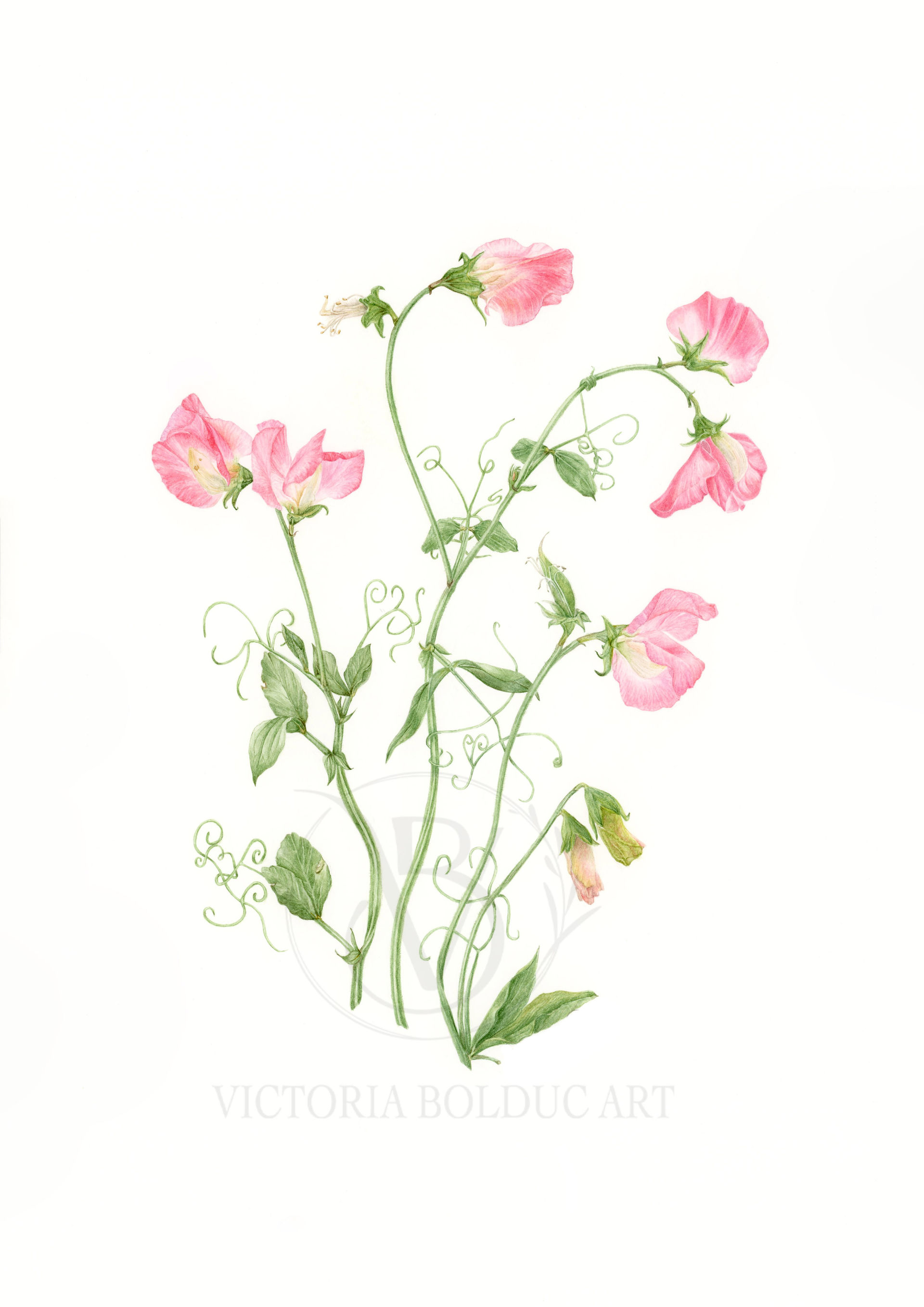 This delicate study of three sweet pea stems captures the soft rose pink of their petals. Known for their intoxicating fragrance, sweet peas were first cultivated in Sicily in the 17th century and have since become a symbol of blissful pleasure and gratitude. Their climbing tendrils make them a favourite in cottage gardens.